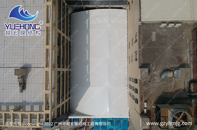 越宏本项案例,根据用户的要求选用PVDF膜材与Q235钢材建造成的膜结构遮阳雨棚。造型是波浪型,尺寸适中,从视觉上看出整体建筑之美。