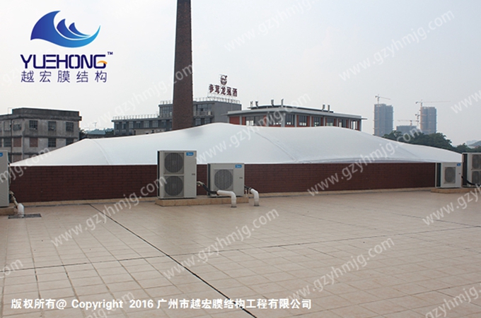 此广州某集团篮球场膜结构遮阳棚案例中,优质Q235钢材,防火防水DB1级,焊接牢固,安装施工周期9天完工,篮球场膜结构遮阳棚造型是弧形棚顶。还能有遮阳、遮雨、遮风等优势,在篮球场发挥了其重要作用,提高了篮球场建筑美观。